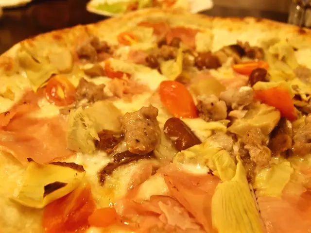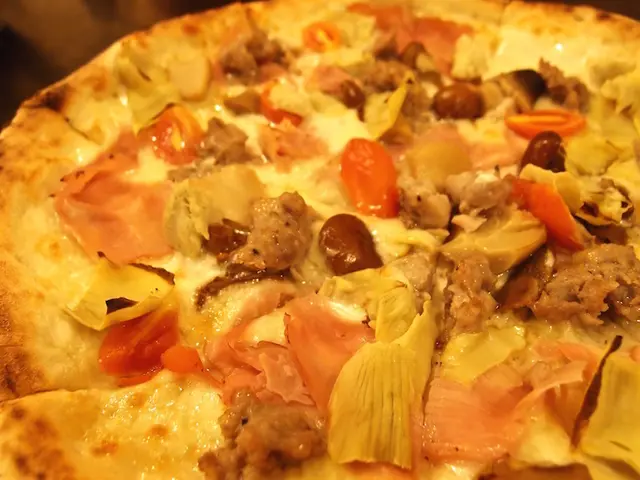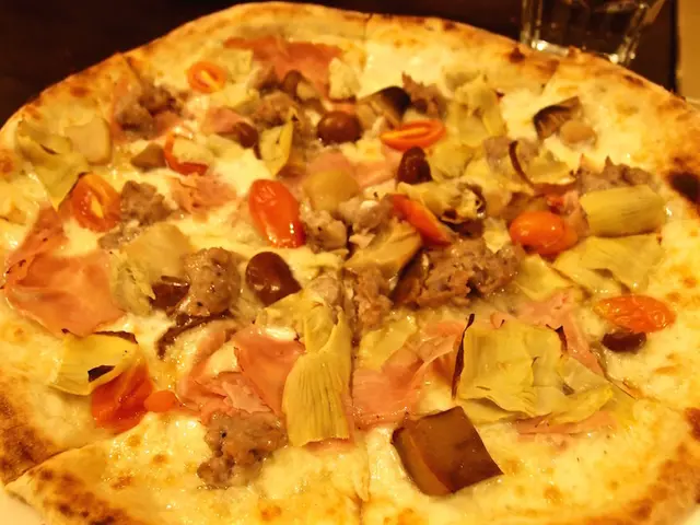 是款白底披薩,食材非常豐富,有莫札瑞拉起司、火腿、朝鮮薊、小番茄、自製肉腸、綜合菇