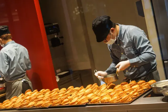 隔著玻璃帷幕,可以清楚看到店員把一盤盤剛烤出爐的彭派令果端出,刷上會讓他亮晶晶的果膠,再整齊地擺上商品架,圍著玻璃窗排隊,口水都快滴下來了!