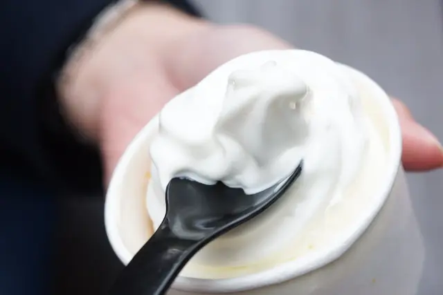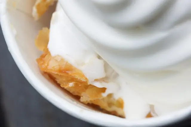 霜淇淋可是融化的相當快速,拿到後就要儘快享用喔!霜淇淋本身口感濃郁,奶香清新不會過重。下方的蘋果派是正常份量的一半,就算上方淋上霜淇淋,還是有著些微溫熱的狀態,派皮雖因濕潤的霜淇淋而顯得沒那麼酥脆,不過主要是感受派皮的香氣!