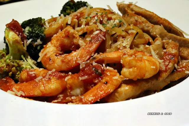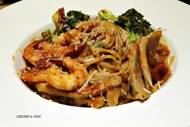 綠花椰菜 番茄丁 甜白蝦 松阪豬頰肉 帕馬森起司
