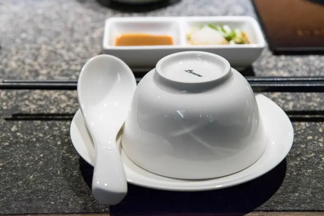 桌上整齊擺放著餐具,熱茶,以及醬料碟