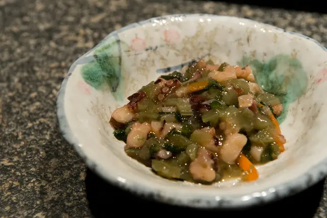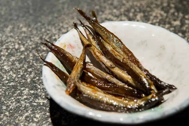 章魚帶有嗆辣黏滑的滋味,刺激著味覺;小香魚使用日式醬汁醃漬風乾,吃來口感扎實夠味