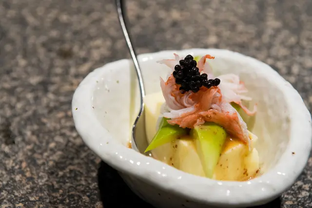 豆腐軟嫩冰心,與蘆筍的脆口形成對比,最後海鮮的滋味更是畫龍點睛