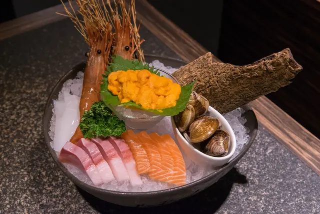 最搶眼的即是滿滿一碟的海膽、兩隻牡丹蝦、青甘及鮭魚生魚片,一旁的蛤蠣和透抽也都相當新鮮