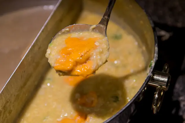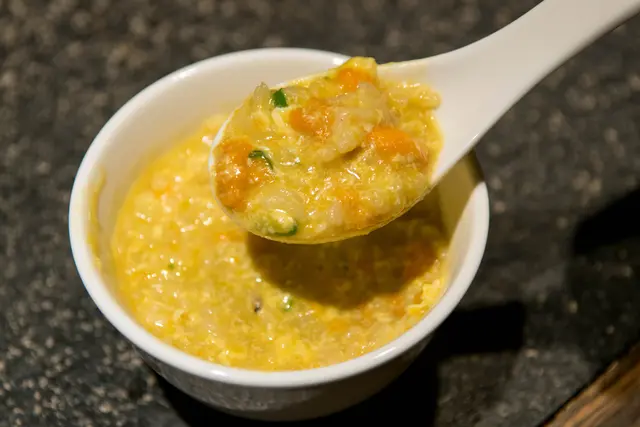 最後的好戲登場,在湯底中加入蛋液、白飯、蔥花,不斷攪拌熬煮,並放入大量海膽