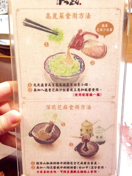 桌上有個小牌子有教人如何使用沙拉醬及豬排醬