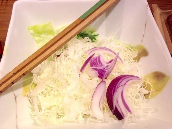 豬排很容易會有一堆哩哩摳摳的小東西,還有那一大盆沙拉就佔很多位置了
