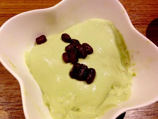 抹茶豆奶布丁上面放的是罐頭紅豆,吃起來硬硬的