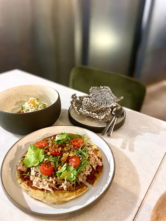 蔥油餅很酥脆,搭配上方的配料,讓整體味道多層次又清爽