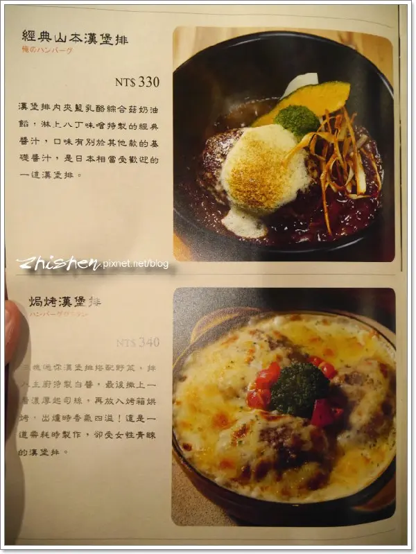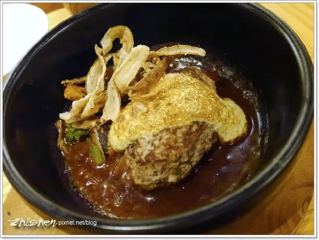 要經典的山本漢堡排高約二公分多,略成橢圓形,有著高雅油香及細緻口感,而且非常多汁,搭配著上頭帶點特殊菇類香氣的乳酪及帶點甜味的特調醬汁(有味噌@@?)一起品嚐,歐伊係…