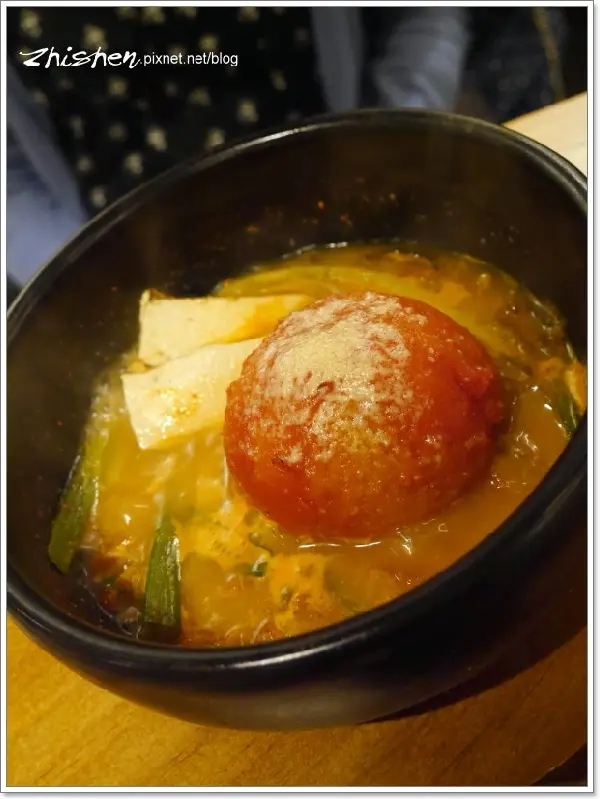 蕃茄鍋非常清爽,漢堡排泡在湯中,完整地吸飽了湯汁、也讓漢堡排自有的油香和肉味變得更加溫和,適合吃清淡口味的朋友!