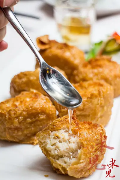 腐皮蟹肉海鮮球,以腐皮包著蟹肉和海鮮做成的內餡再去炸過,咬起來皮很酥脆,淋上微酸帶甜的醬汁(也是阿桐師傅自己做喔!)喜歡炸物的人一定要點。