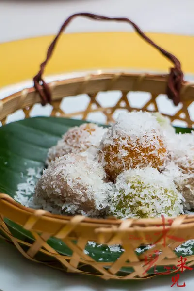 泰式糯米球,糯米做成的小丸子裡包著椰糖煮過的椰絲,外頭再裹上椰子粉,吃起來彈軟又充滿多層次的椰香。
