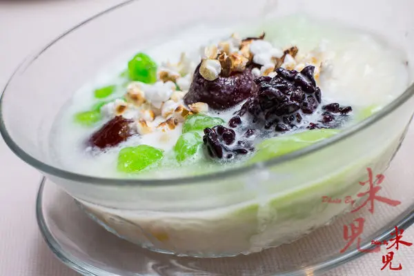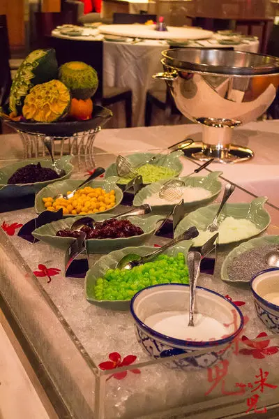 泰式饗樂冰品集的冰品,裡頭有很多配料,包括蜜白果、紅棗、珍多、米線、黑糯米、山粉圓等等,最後淋上椰奶和甜味淡奶,灑上爆過的米,正常版是要加碎冰啦!但米兒不吃冰所以完全沒加冰,吃起來也是香甜可口喔!