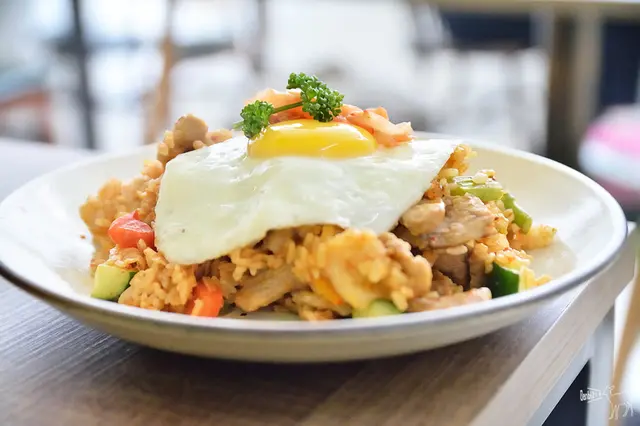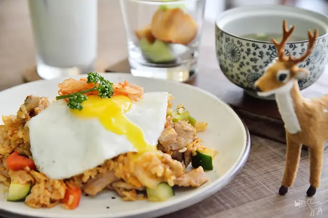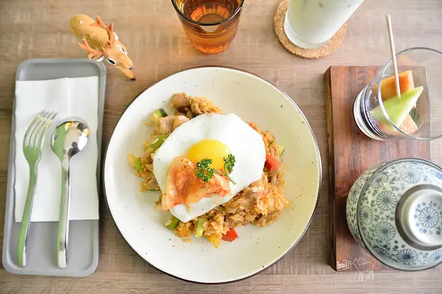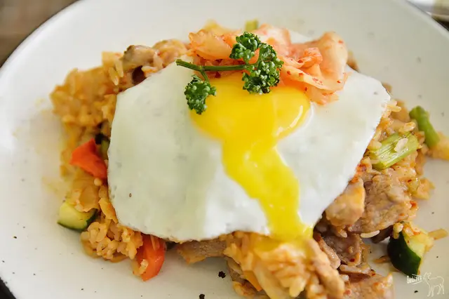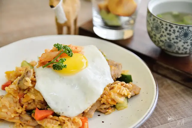 儲房咖啡館的私房料理會不定期更換,我去的那天是泡菜豬肉炒飯加上一顆半熟蛋,聽起來就很心動,原本只是想來這吃甜點的,立馬腦波很弱的點了一份!