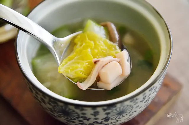當日附的湯是滿滿的魷魚、絲瓜、香菇、白菜湯,魷魚使得湯喝起來有濃郁的海味,相較於常會出現的味噌湯、海帶湯,這樣的湯品讓人覺得格外用心。