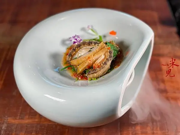 海鑽石,以特製的食器盛裝上桌,底下埋伏著乾冰,上桌後慢悠悠地釋放出仙氣,畫面極美。鮑魚是用低溫真空的方式處理,保留了鮑魚的甜嫩,再以酸辣醬汁佐味。