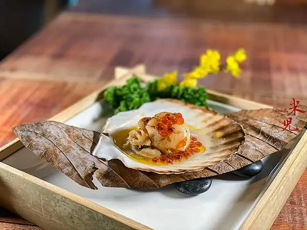 一葉扁舟,在蒲葉上放上乾煎奶油大扇貝,點綴著晶瑩的鮭魚卵,鹹香鮮甜交織出的海洋風味。
