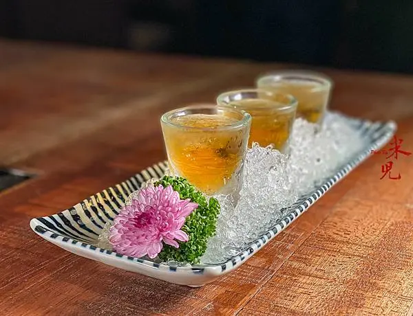 灑了玫瑰花瓣的水雲澗,以橘醋與山藥泥搭配來自沖繩長壽村的水雲藻,調和出酸爽清新的滋味,喝了胃口全開,準備開始享受美好的饗宴。