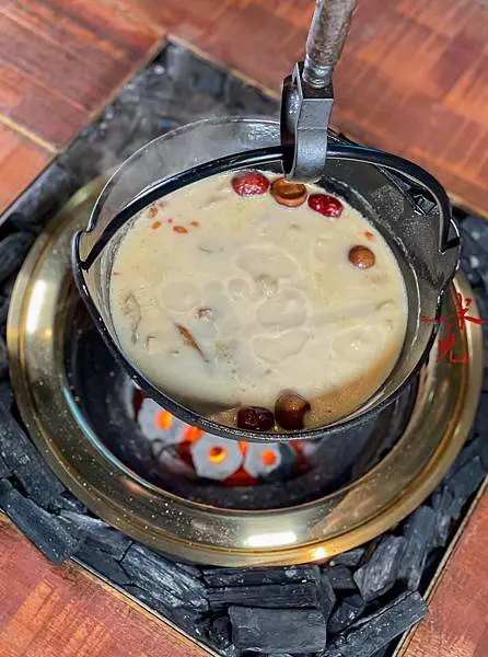 撤走烤網後,加上鑄鐵鍋,鍋底是濃白的貢布古椒雞湯,使用的是柬甫寨貢布特產的白胡椒,帶有一種獨特的花香,與豬肚與雞腿、豬骨一起熬煮出濃白溫和不嗆辣的濃郁鍋底,因為放了桂圓紅棗等還有一些中藥材,帶著淡淡藥香,喝起來溫潤鮮甜。