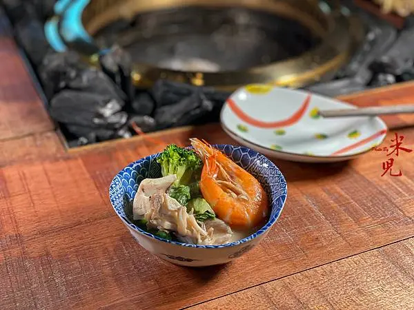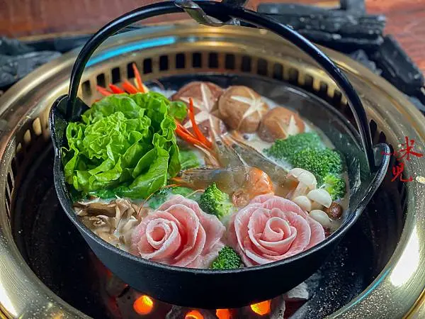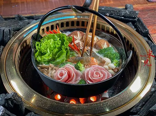 寬巷子從開幕以來就一直走的是 『很好拍 』的美學鍋物風格,開了微風信義店之後我這還是第一次造訪,沒想到2020年底推出了 「店中店 」模式,把16個客席改造成如同日本農家地爐的氛圍,讓訂到位的客人可以先享用精緻的前菜,然後是炭火燒肉,最後架起鑄鐵鍋,煮起花開朵朵的美型火鍋,有趣的是,因為鍋子是垂吊在半空中,所以一邊煮火鍋還會一邊慢悠悠地晃盪著,那天中午陽光斜射在很有老上海復古風格的畫壁上,質樸的木桌與炭火相映成趣,飄著白胡椒暖香的白湯在鑄鐵鍋裡咕嘟咕嘟冒著熱氣,飽到有點愣神的我,一煞那間有點迷失在這樣讓人覺得歲月靜好的氛圍裡。