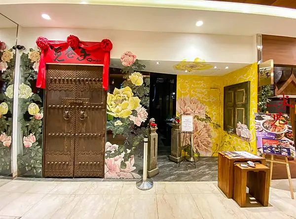 門口花團錦簇的壁畫配上厚重的鉚釘鈢門與紅色牌匾,中國風十足。