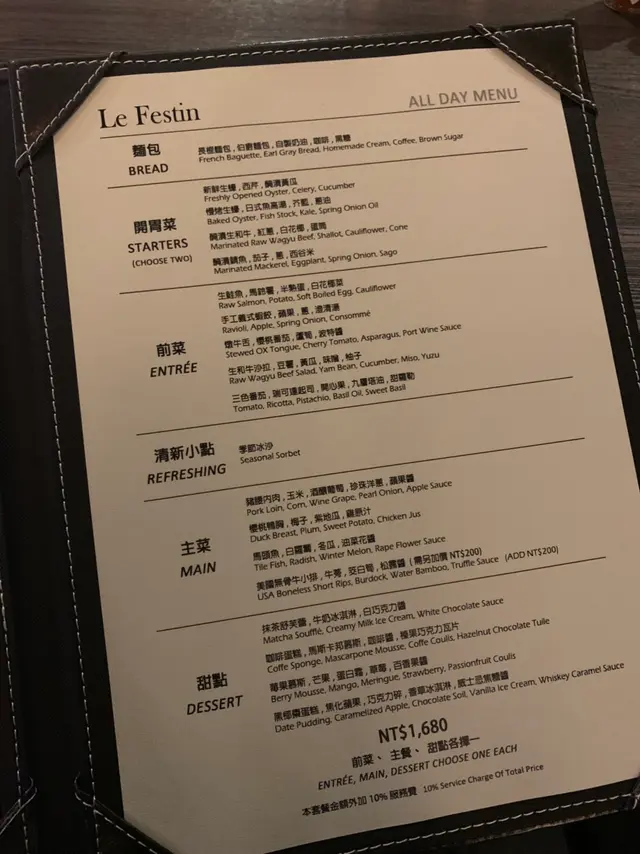 餐廳菜單以套餐為主,$1680/套餐  內容包含:餐前麵包+開胃菜(擇二)+前菜(擇一)+清新小點+主菜(擇一)+甜點(擇一),選擇多樣,而且內容十分豐富,Joyce推薦可以直接點套餐!當然囉,喜歡自己選擇或是只想來小酌的人,也有提供單點選擇,每個人只要點滿低消就可以。位在大直明水路,附近交通算方便,環境座位舒適,乾淨整潔,服務人員親切有禮,對餐廳也很熟悉,總是能貼心細心提供專業服務,我們有任何需求也都能即時處理完成,餐中店家知道我們有孕婦也想吃牛排,所以特別幫我們將半份做成全熟,好暖呀! 😛