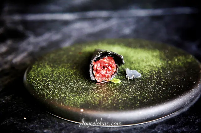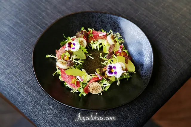 ▼搭配白花椰醬和醃漬過的生牛肉捲入其中,甘甜醬汁下手有些過重,稍有些掩蓋掉生牛肉本身甜味,但整體吃起來美味,上頭酸豆有解膩效果。