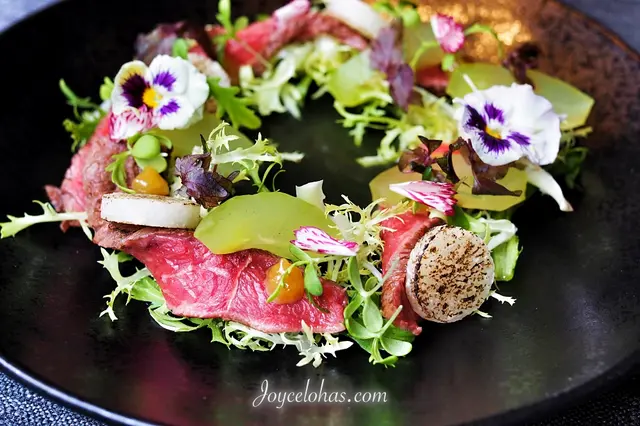 ▼ 綠捲、豆薯、大黃瓜等蔬菜做為沙拉基地,生牛肉口感軟嫩,有一點炙燒過熔化後的脂香更迷人,淋上味噌醬,先嚐嚐原味,再搭配柚子醬享用,多了酸甜風味更爽口呀!