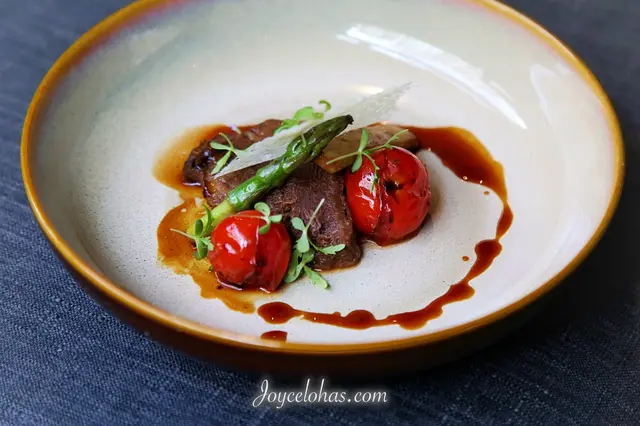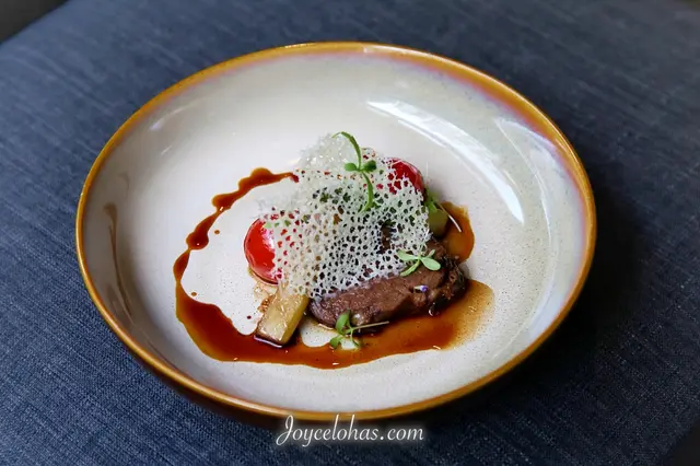 燉煮透徹的厚牛舌,搭配波特醬,吃起來甜意重,可以和旁邊醃漬櫻桃番茄和帕馬森起司一起吃,喜歡味覺層次豐富的感覺。