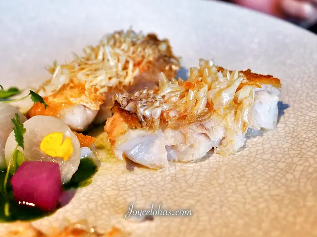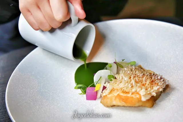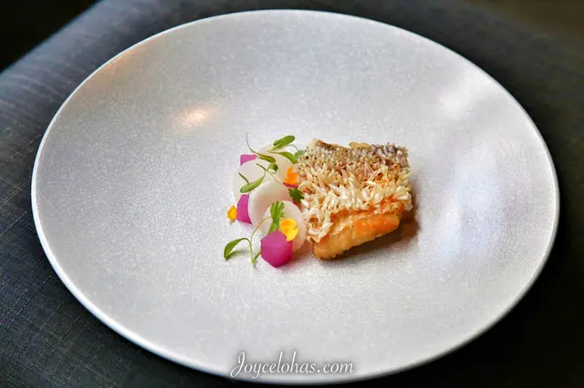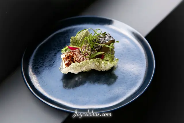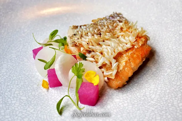 用米餅盛裝,看起來視覺特別亮眼!以珍珠洋蔥和茄子搭配呈現,鯖魚口感緊緻細嫩,甜香四溢,相當美味。