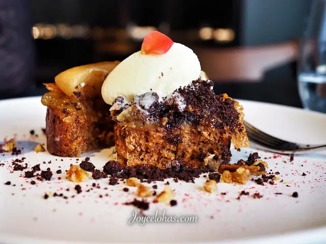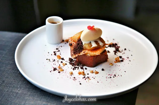 在台灣的法式餐廳吃到椰棗蛋糕覺得相當特別,熱熱上桌,擺盤令人食指大動,蛋糕體本身口感綿密紮實,搭配裡面酥脆巧克力餅乾,暖暖氣息隨著威士忌酒味帶出迷人焦糖香,熱蛋糕配上香草冰淇淋冷熱交織的風味,最後在以蘋果的酸甜收尾,多變層次,甜而不膩,非常美味!