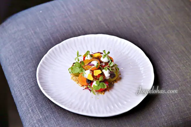 ▼前菜 – 「三色番茄.開心果.瑞可達起司.蜜餞.九層塔油」$320