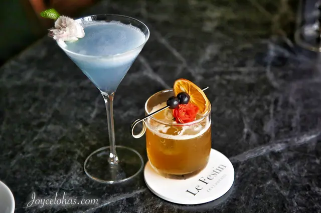 天空藍色那杯,是以琴酒搭配黑櫻桃酒、紫羅蘭,很適合搭配沙拉,清爽滋味盡在不言中。