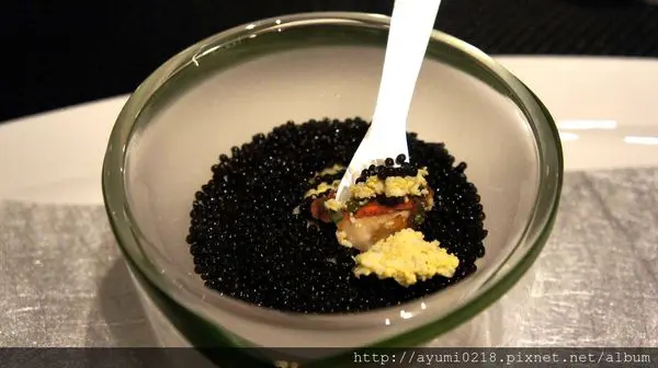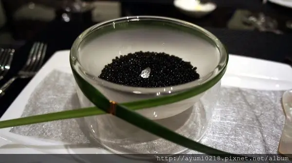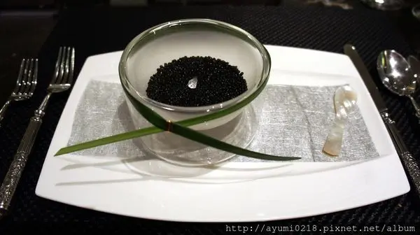 這道端上桌..我以為要挑選珠寶了..這銀柏..及滿滿的鱘魚子醬..還有貝殼湯匙