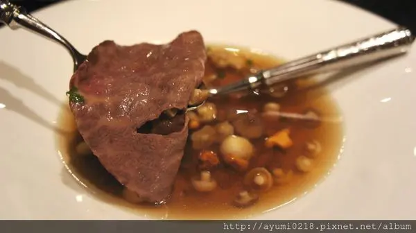 湯頭很簡單~簡單的菌菇和風清湯..沖入和牛肉片上方