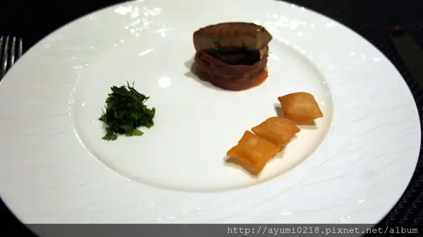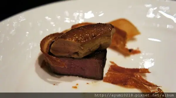 牛舌細緻滑嫩的肉質口感,以番紅花蜂蜜等七種香料慢燉,口感濃郁且略帶甜蜜,循傳統法菜做法,將培根煎至酥脆略帶焦香氣息,吊出鹹味,多餘油魯滋潤下搭配鴨肝食用,加上義大利Pizza為靈感的馬鈴薯泡芙點綴,整道菜味道濃烈,話題十足.