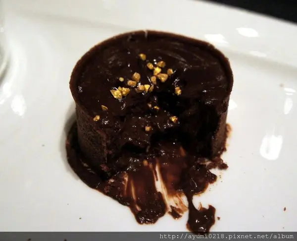 上頭的杏仁角好像撒了金粉..在深咖啡色的巧克力溫泉中格外閃亮