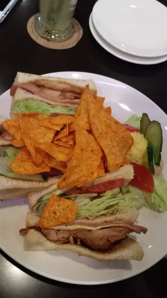 總匯三明治 - 主要是用燻豬肉、火腿、裡面有滿滿的生菜,旁邊有一個馬鈴薯泥、小黃瓜、生菜他是加上千島醬上面的多力多滋可以加馬鈴薯泥一起吃,更美味^^