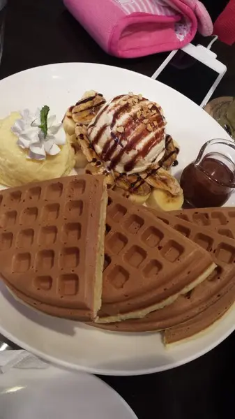 香蕉巧克力冰淇淋鬆餅 - 但我們把上面的巧克力冰淇淋換成香草冰淇淋呢^^鬆餅加上冰淇淋真是美味如果女孩子們當時無法吃冰,旁邊也有卡士達和巧克力可以加喔,美味無比阿