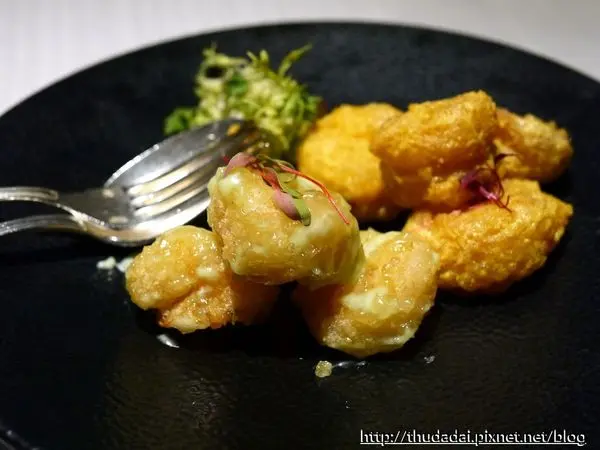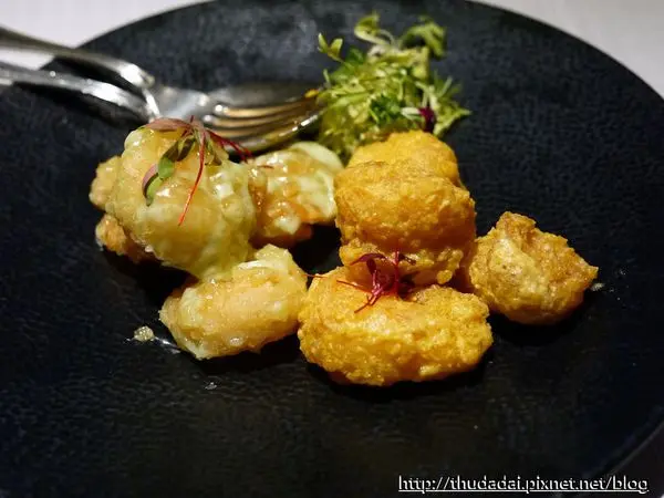 薄薄一層柔順、滋味濃淡適宜,鹹蛋黃蝦仁表面是仍維持酥脆感的。