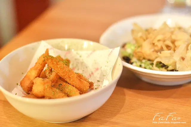 隔沒多久炸物就上桌,本來是坐在面向層架的位置,光線是空間中最足夠的,