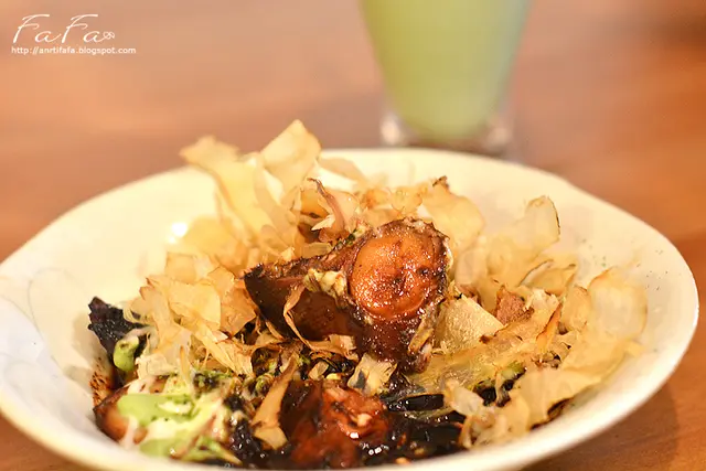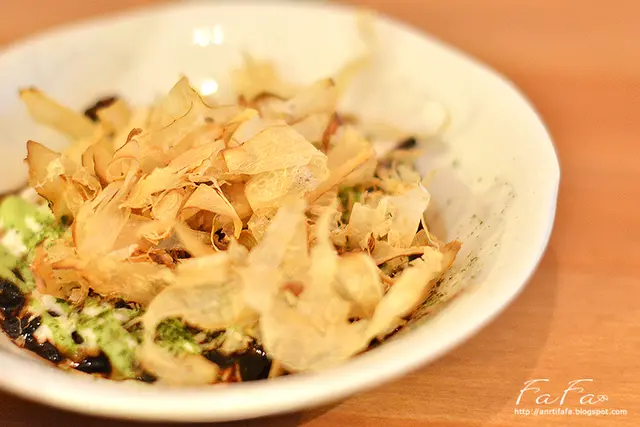 剛剛看是在黑鍋子以及黑色醬汁中,接著變為盤子上的章魚燒是店家貼心切片後淋上醬汁、美乃滋、芥末醬與柴魚片,