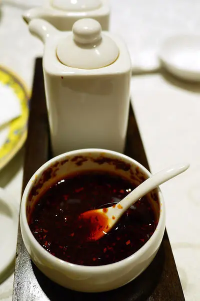 瓷碗裡裝著的辣椒看起來顏色很深,感覺像是地獄麻辣,但其實辣度適中,能巧妙的提出食物的美味度。