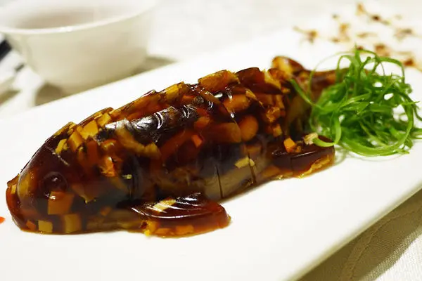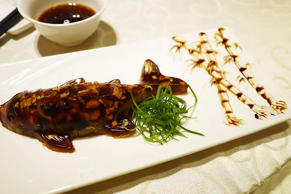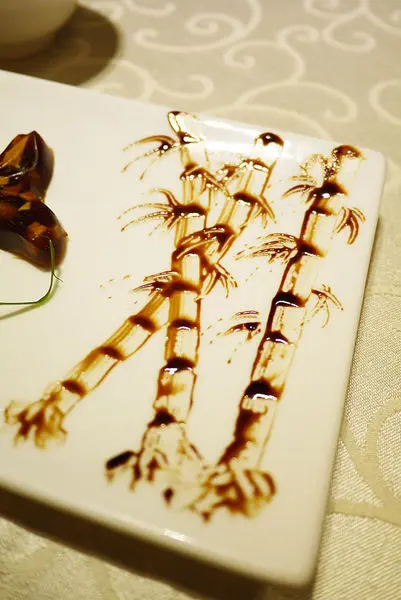 率先第一道上菜是涼菜的部份,老北京豆醬上桌,看到的是一條金魚的形狀,這讓我十分驚喜!而且長方形的瓷盤上還用了醬料畫成了竹子做裝飾,能在品嚐美食前先欣賞師父的藝術品,所謂的「美食」,講究的不就是色香味俱全,這點全都在這道菜裡表現出來了。