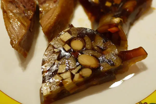 而這道老北京豆醬,深褐色的凍狀物是醬,就是肉凍成型前為醬色濃湯,而豆醬之名,則是因為裡面加入了青豆、黃豆、豆干粒等,來增加風味及口感。