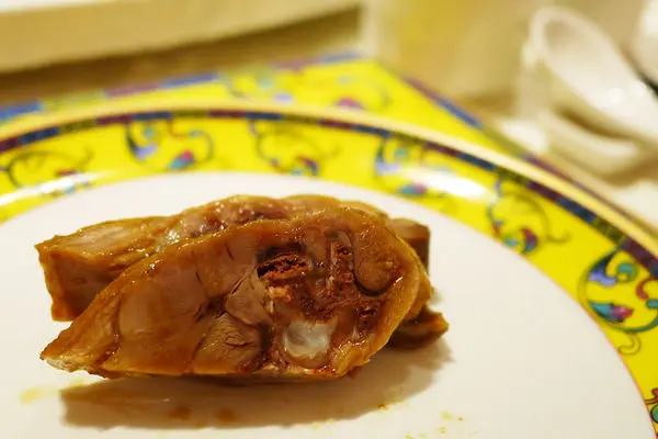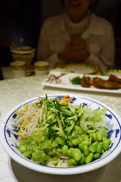 這道傳統的北京涼菜,嚐起來味道冰涼爽口,肉凍Q彈,濃湯的滋味在肉凍被舌尖的溫度融化開來後,在味覺上感受到濃湯的精華,而且鹹度適中,而每一口都嚐得到加入在裡面的豆子,果真有多層次的口感,我好喜歡這道涼菜。