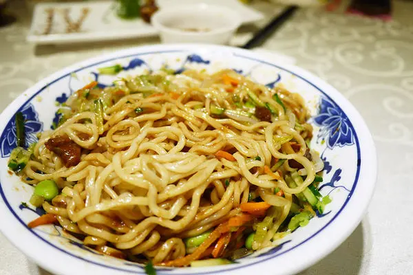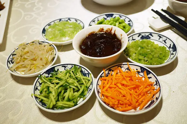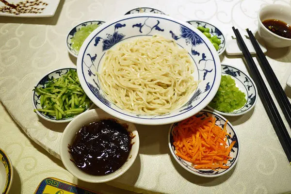 「老北京炸醬麵」是一道傳統地道的北京麵食,送上來時將麵和各式配料都分開擺放,呈現出梅花的擺盤狀,看起來豐盛美味。