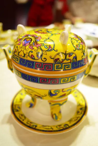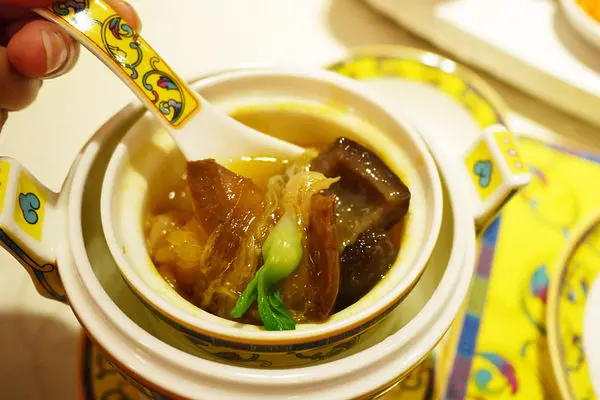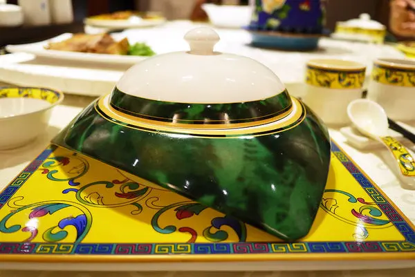 接著送上宮廷菜「四寶彿跳牆」,是一道北京宮廷菜,這道菜採(位上),也就是每人一份,用和餐具同款花色的小鼎鍋,感覺真的好似在宮殿裡被服待的感覺啊!