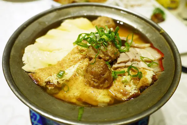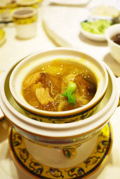 掀開蓋子後,裡面的一個小碗裡裝著就是四寶彿跳牆,這道菜是以熬煮了三天的老母雞湯為底,放入了蔘、鮑、翅、花膠、干貝等頂級乾貨,用文火慢燉,來保留食材的精華,一滴不流失的讓人嚐到原汁原味。